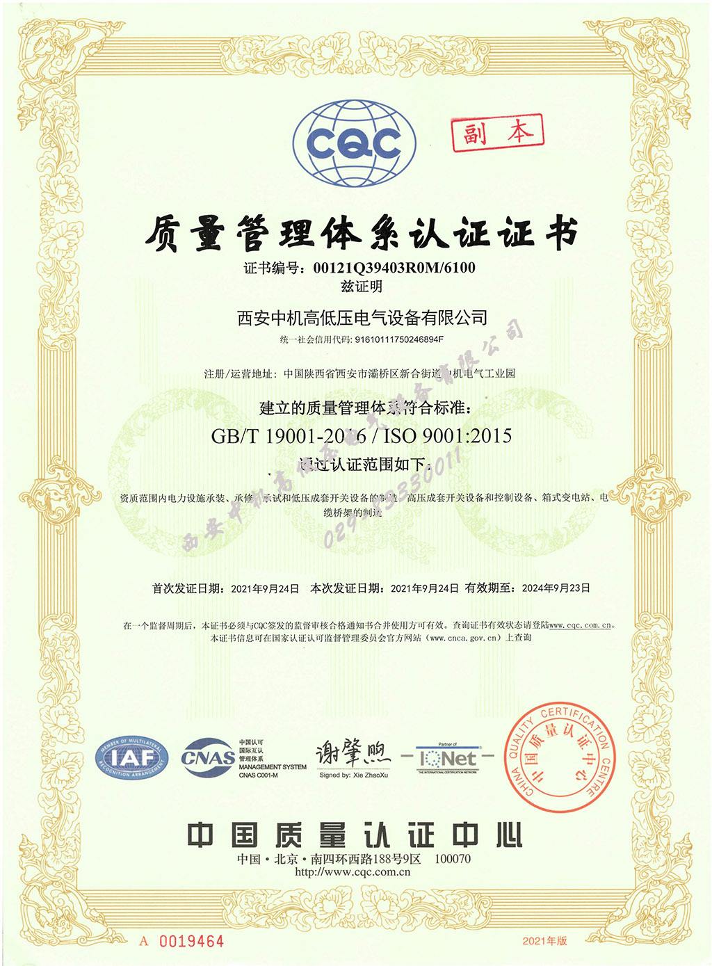 質(zhì)量管理體系證書(shū)9001